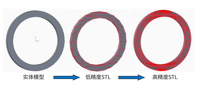 如圖所示,STL模型是以三角形集合來表示物體外輪廓形狀的幾何模型。三角面片越小越接近實(shí)體模型。在實(shí)際應(yīng)用中對(duì)STL模型數(shù)據(jù)是有要求的,尤其是在STL模型廣泛應(yīng)用的RP領(lǐng)域,對(duì)STL模型數(shù)據(jù)均需要經(jīng)過檢驗(yàn)才能使用。這種檢驗(yàn)主要包括兩方面的內(nèi)容:STL模型數(shù)據(jù)的有效性和STL模型封閉性檢查。有效性檢查包括檢查模型是否存在裂隙、孤立邊等幾何缺陷;封閉性檢查則要求所有STL三角形圍成一個(gè)內(nèi)外封閉的幾何體。3D行業(yè)內(nèi)一般稱這樣的幾何體為水密檔。這可解疑近期客戶疑惑為什么會(huì)有破面,孔的尺寸為什么會(huì)小了,圓形為什么變多邊形了等。